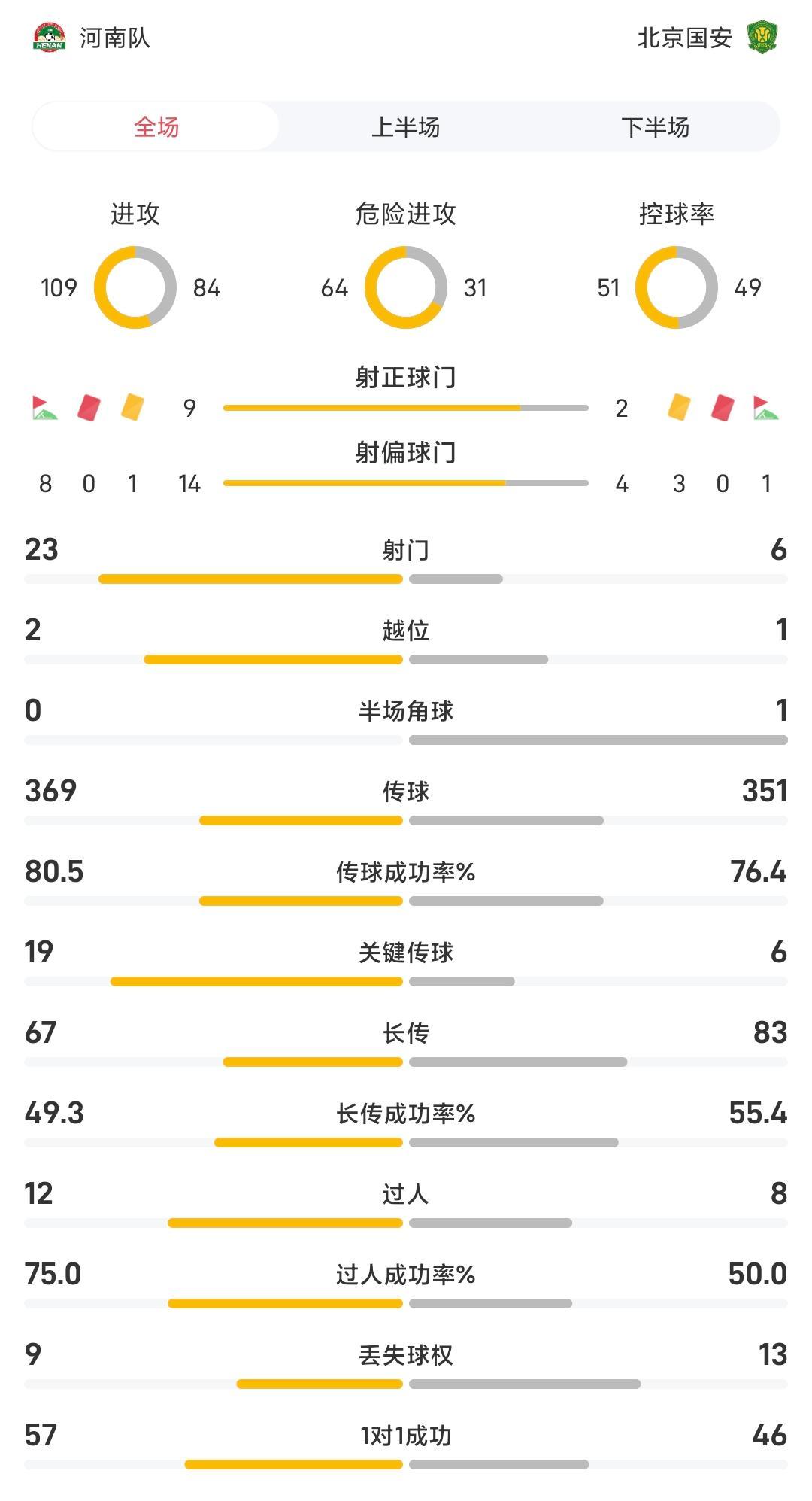 射门数方面,国安仅6脚打门,2脚射正;对手河南队狂轰23脚射门,9脚射正。危险进攻数河南高达64次,是国安的两倍。