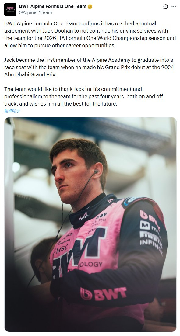 Alpine F1车队官宣与杰克·杜汉共同达成协议,双方将不再继续合作,并允许杜汉寻找职业生涯的其他发展机会。